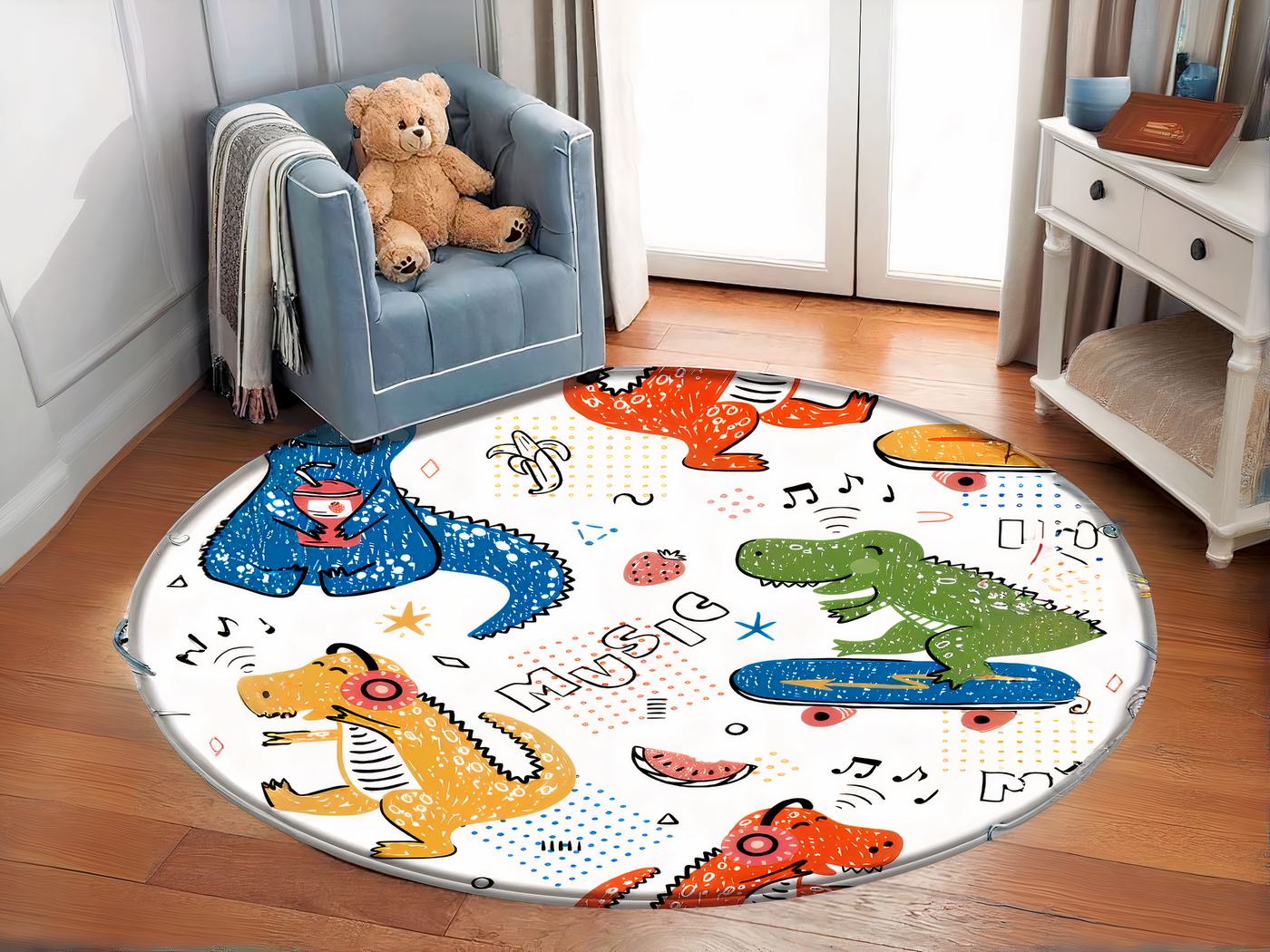 Ce tapis a le motif d’un dinosaure qu’écoute de la musique. Il est parfait pour tout petit amateur de dinosaures et est sûr d’égayer n’importe quelle pièce.