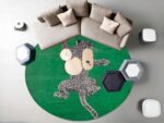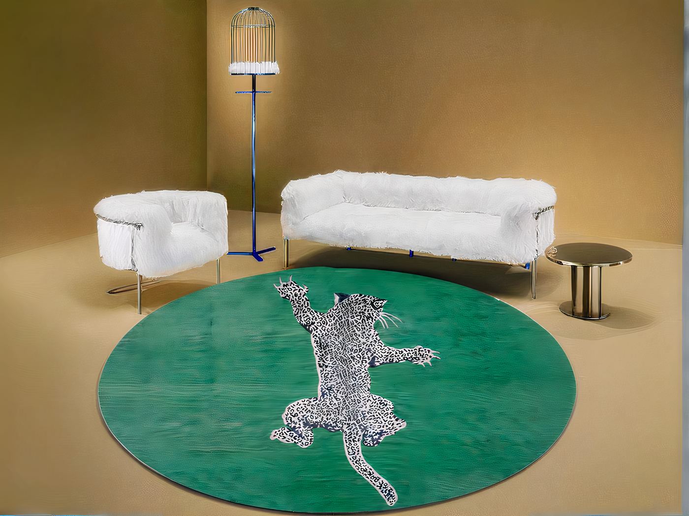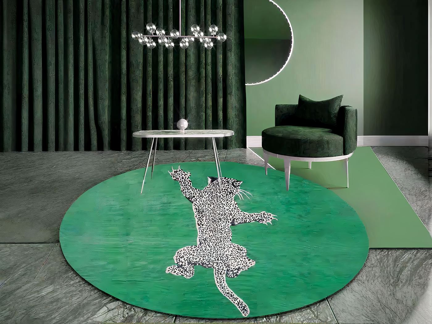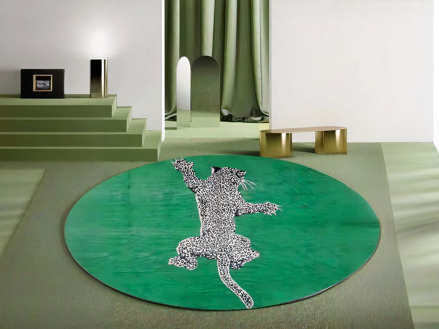 L’imprimé de ce tapis léopard audacieux est compensé par le fond vert, créant un look à la fois ludique et élégant. La forme ronde est parfaite pour ajouter une touche de fantaisie à votre espace, et sa petite taille permet de l’intégrer facilement dans n’importe quelle pièce.