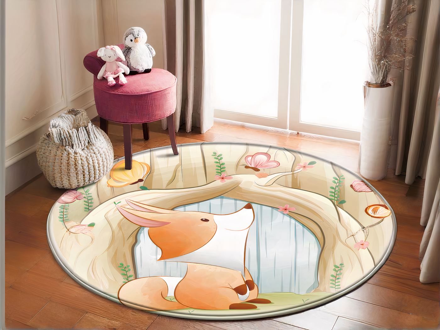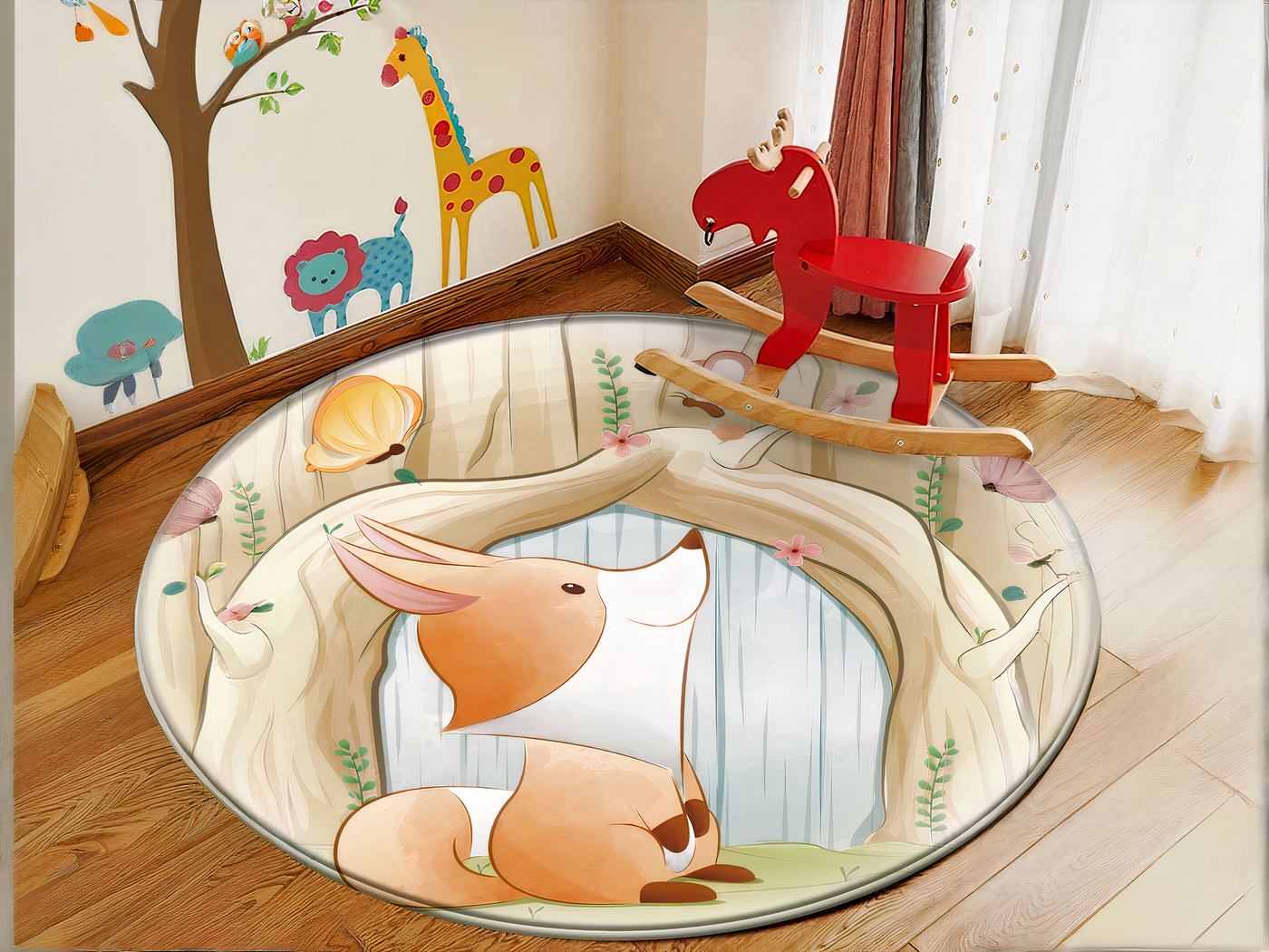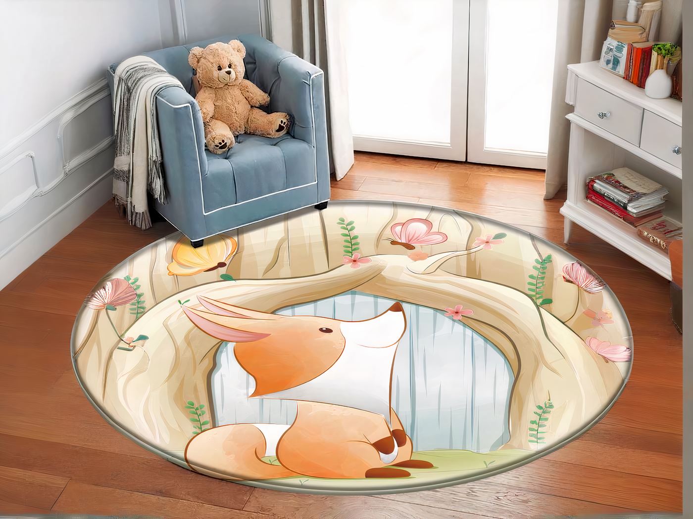 Ce tapis renard dans la foret est idéal pour les chambres d’enfants et les nurseries. Il est fait de 100% polyester et est très doux au toucher. La surface du tapis est en peluche et le fond est en tissu non tissé.