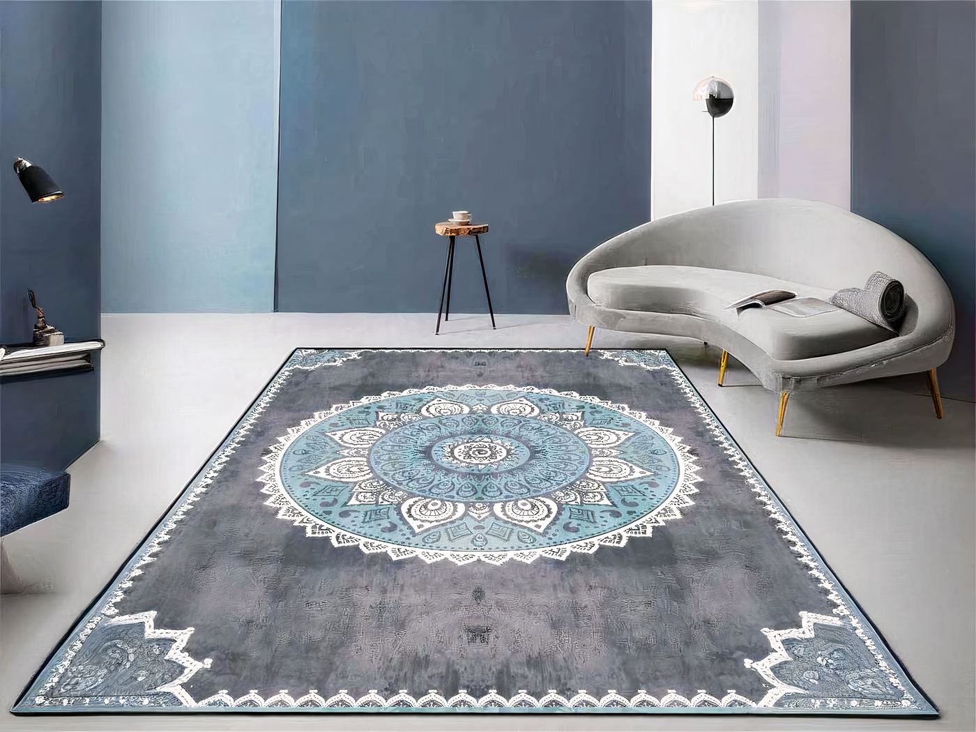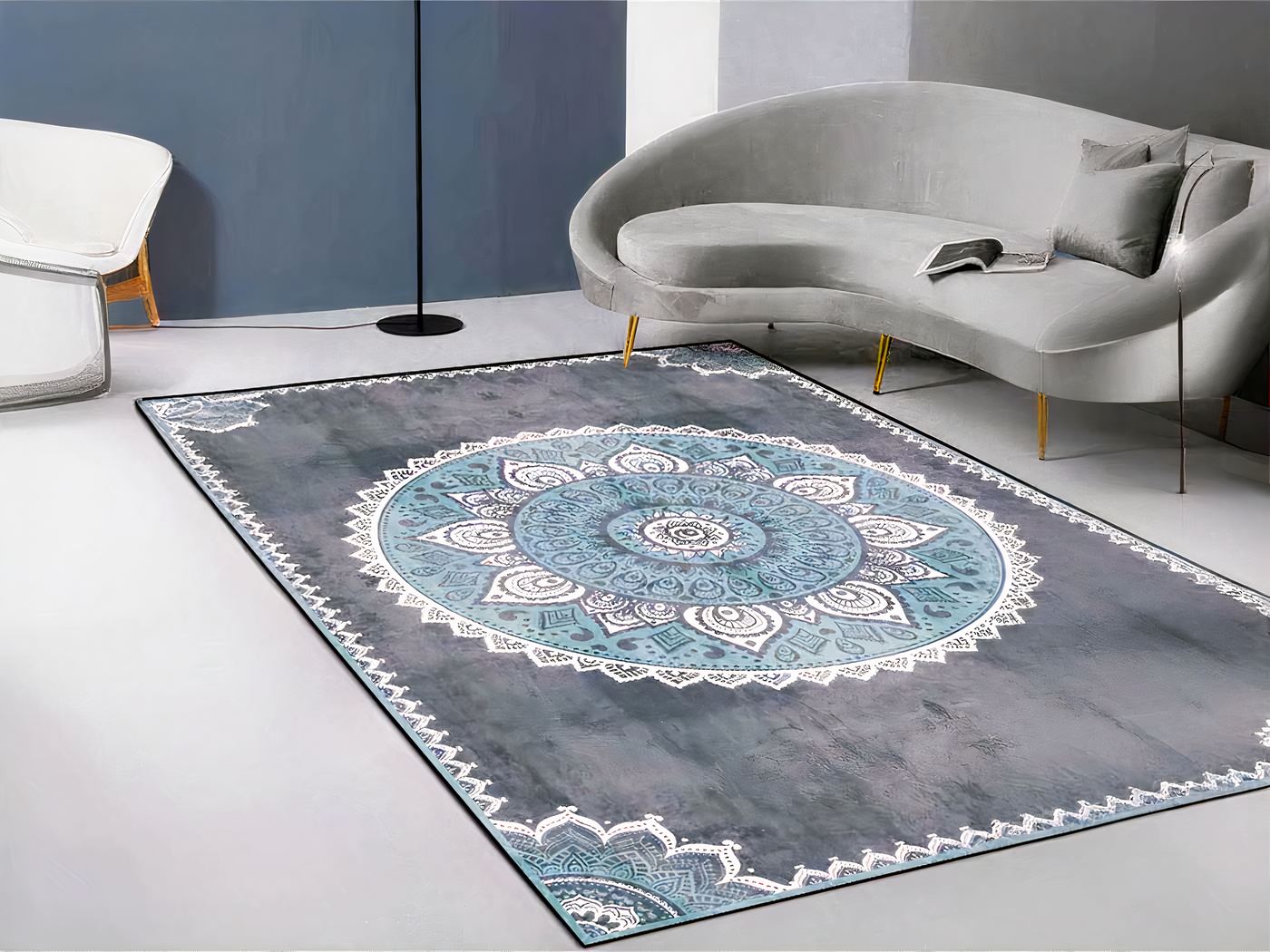 Ce tapis vintage mandala bleu est idéal pour une décoration chic et ethnique. Il est orné d’un motif central en forme de mandala bleu nuit, entouré d’un liseré blanc et d’un bord coloré. Ce tapis est très confortable sous les pieds et apportera une touche chic à votre intérieur.