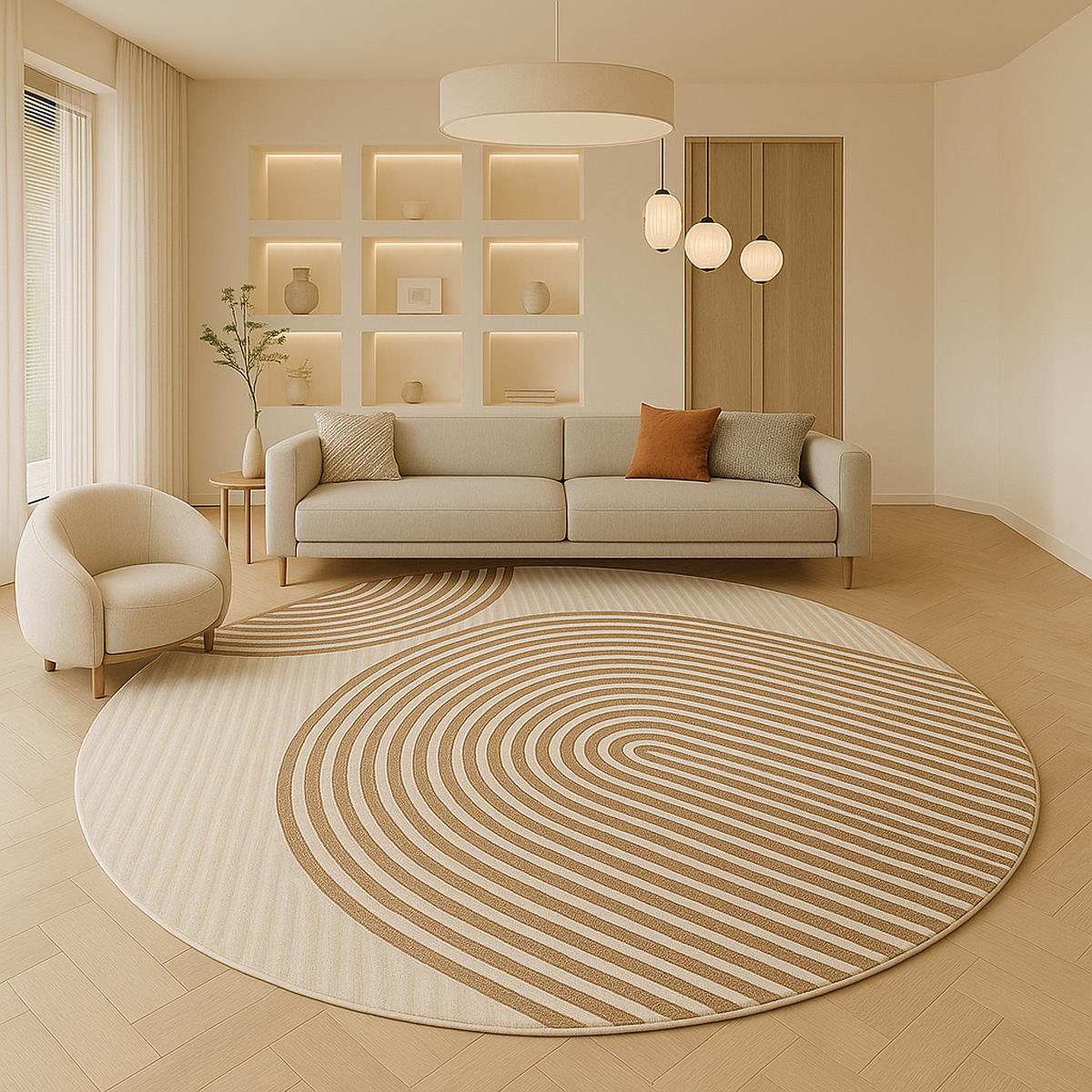 Le motif en courbes concentriques rappelle les sillons tracés dans les jardins secs japonais. Il impose un rythme visuel sans agitation, structurant la pièce sans la figer. La lumière glisse sur les reliefs, révèle la texture et invite au regard contemplatif.