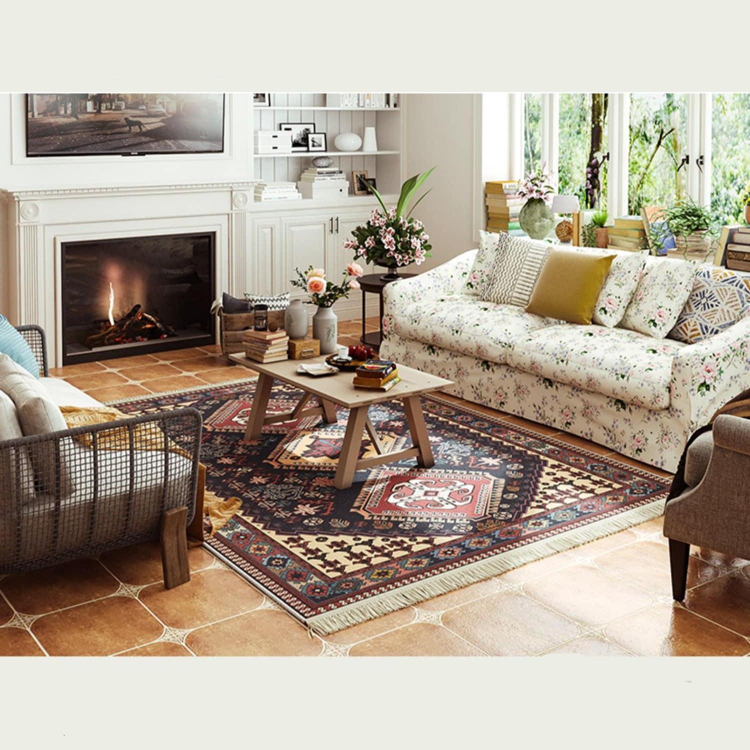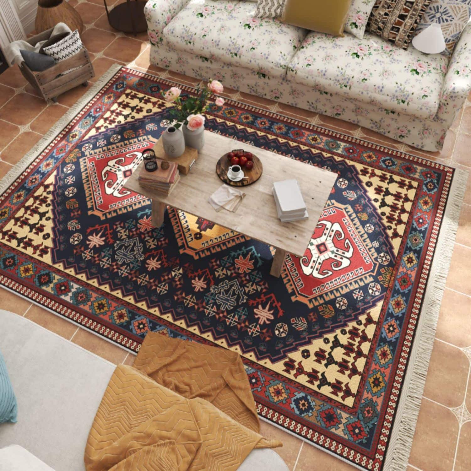 Le tapis marocain rétro rectangulaire formes géométriques multicolores est confectionné à partir de matériaux de haute qualité, ce qui lui confère une grande résistance et une douceur incomparable.
