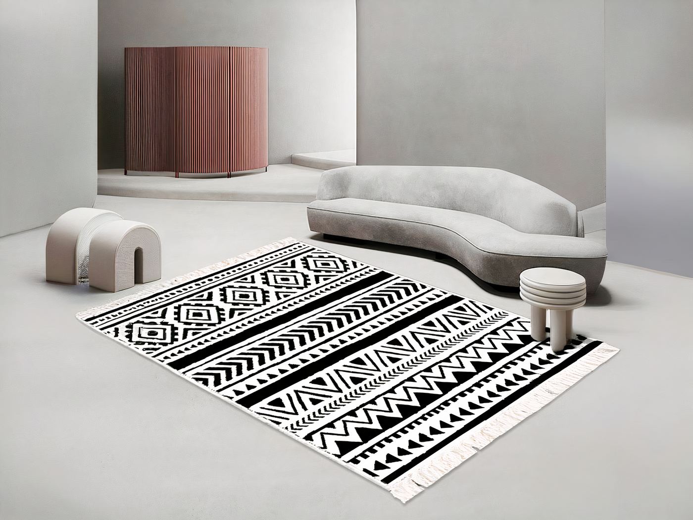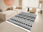 Avec ses motifs géométriques noirs et blancs, il apporte une touche de sophistication à n’importe quelle pièce. Le tapis est fabriqué à partir de laine de haute qualité, ce qui le rend doux et confortable sous les pieds. Les franges ajoutent une touche supplémentaire d’élégance et de charme rustique.