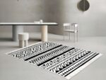 Le design de ce tapis est inspiré des motifs traditionnels marocains, avec des formes géométriques noires et blanches qui créent un effet visuel saisissant. Les motifs sont disposés de manière symétrique sur toute la surface du tapis, créant ainsi une harmonie visuelle parfaite. La frange qui borde le tapis ajoute une touche d’élégance supplémentaire, tout en renforçant l’aspect authentique et artisanal du produit.