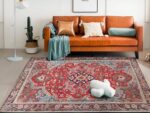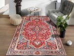 Le design du tapis est inspiré des motifs classiques de l’Orient, avec des couleurs chaudes et vibrantes qui rappellent les marchés animés et colorés des souks. Les nuances de rouge sont particulièrement remarquables, avec des tons allant du bordeaux profond au rouge vif éclatant.
